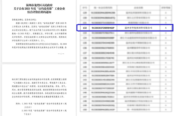 近日,溫州市龍灣區(qū)人民政府公布2021年龍灣區(qū)(高新區(qū))“畝產(chǎn)論英雄”工業(yè)企業(yè)綜合評(píng)價(jià)結(jié)果,溫州市華海密封件有限公司被評(píng)為A類(lèi)企業(yè)。